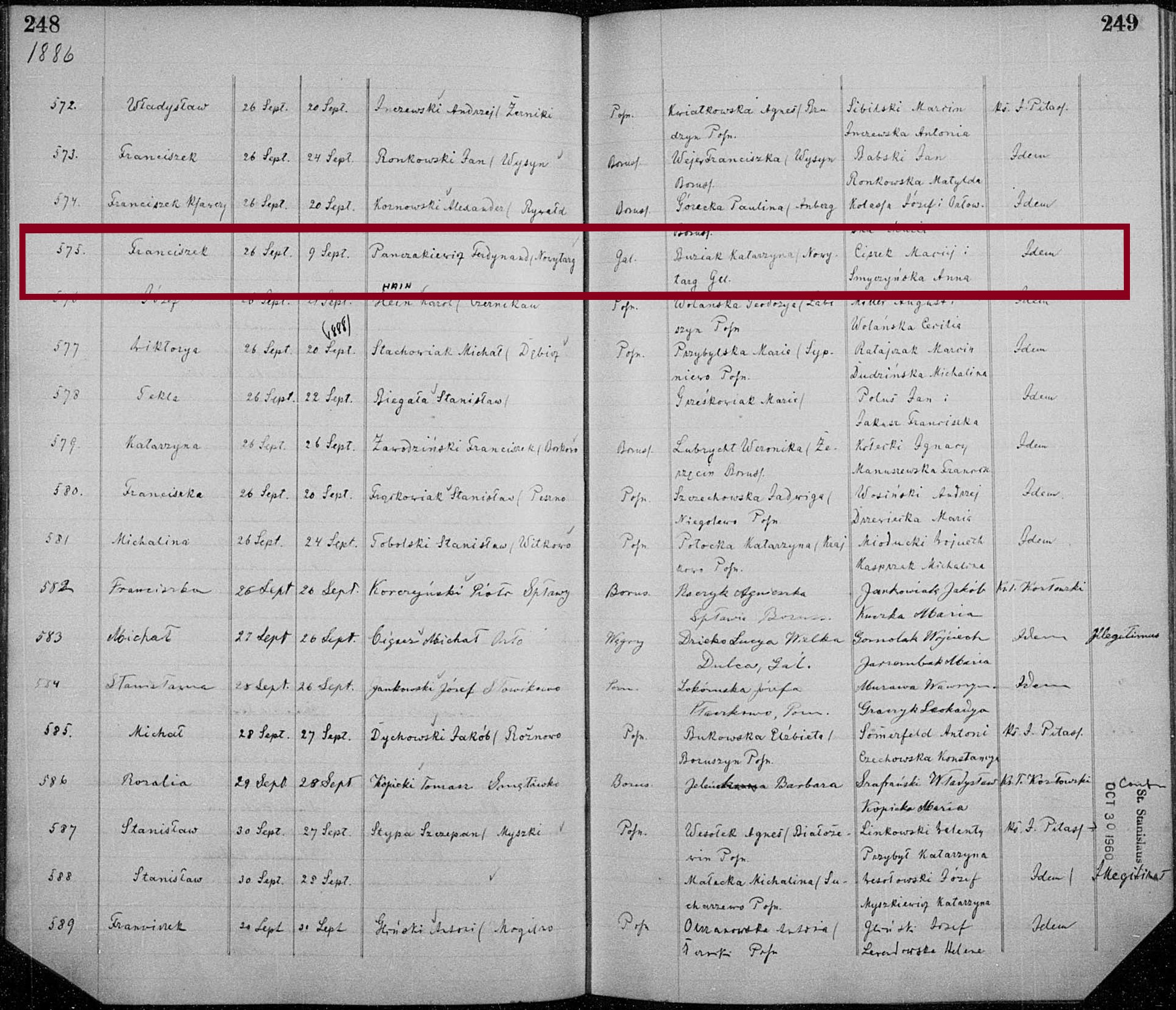 A son, Franciszek Panczakiewicz, was born 9 September 1886 in Buffalo, Erie, New York, and baptized 26 September 1886 at Saint Stanislaus Bishop and Martyr Church in Buffalo. His parents were Ferdynand Panczakiewicz and Katarzyna Buziak [sic] from Nowy Targ, Galicia.