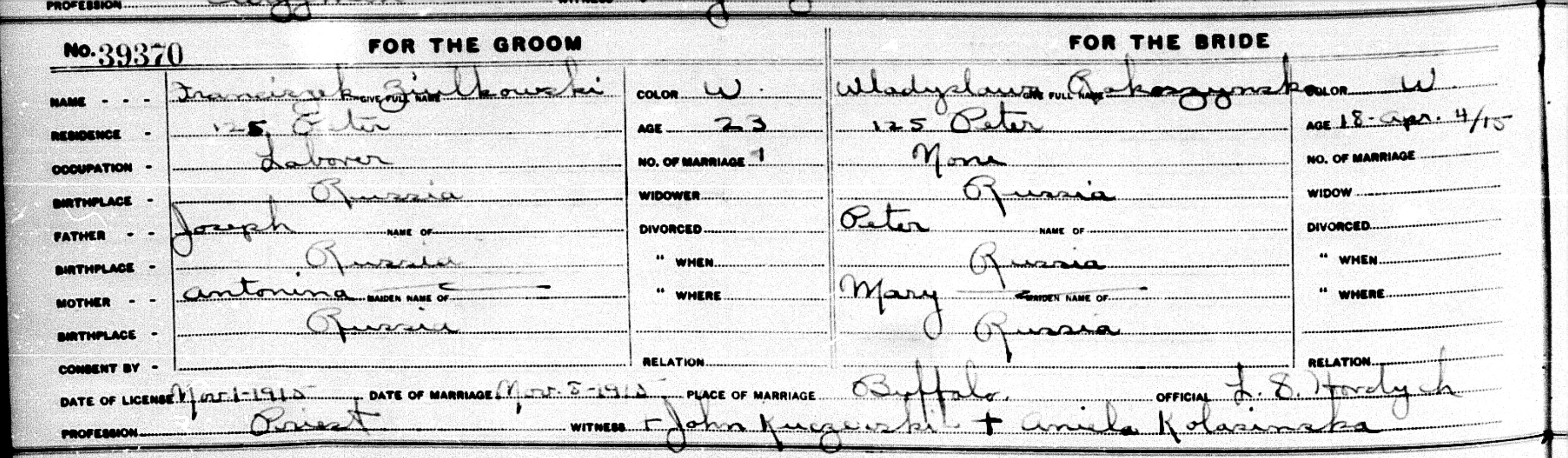 Franciszek Ziółkowski and Władysława Rakoczyńska were married 8 November 1915 in the Church of the Assumption of the Blessed Virgin Mary in Buffalo, Erie, New York, United States. The witnesses were Jan Kuczerski and Aniela Kolasinska.